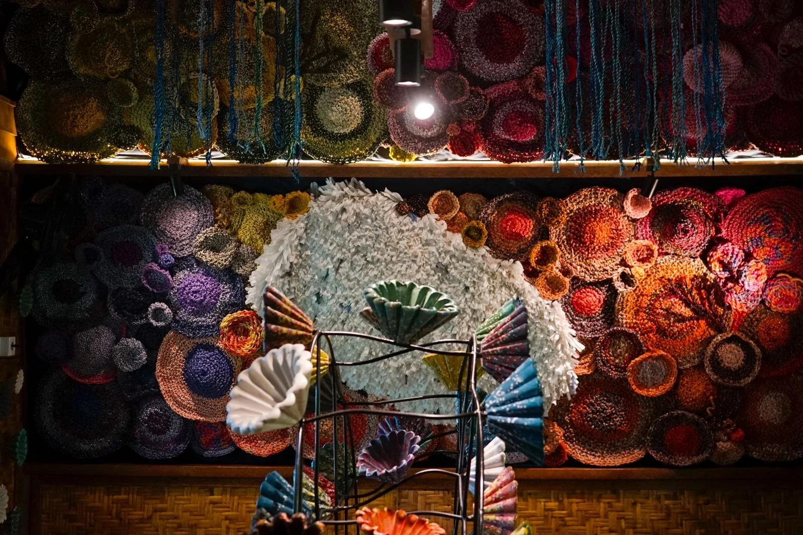 Today Elissa conceptualises new ways to reimagine waste materials of all types, from plastic and textiles to natural fiber and wood – working closely with her team to translate her concepts into artworks that honour Indonesian artistic traditions. Her creative inspiration pulls from a vast bank of traditional and contemporary folk-art techniques as well as modernist art, abstract expressionism and color field painting.